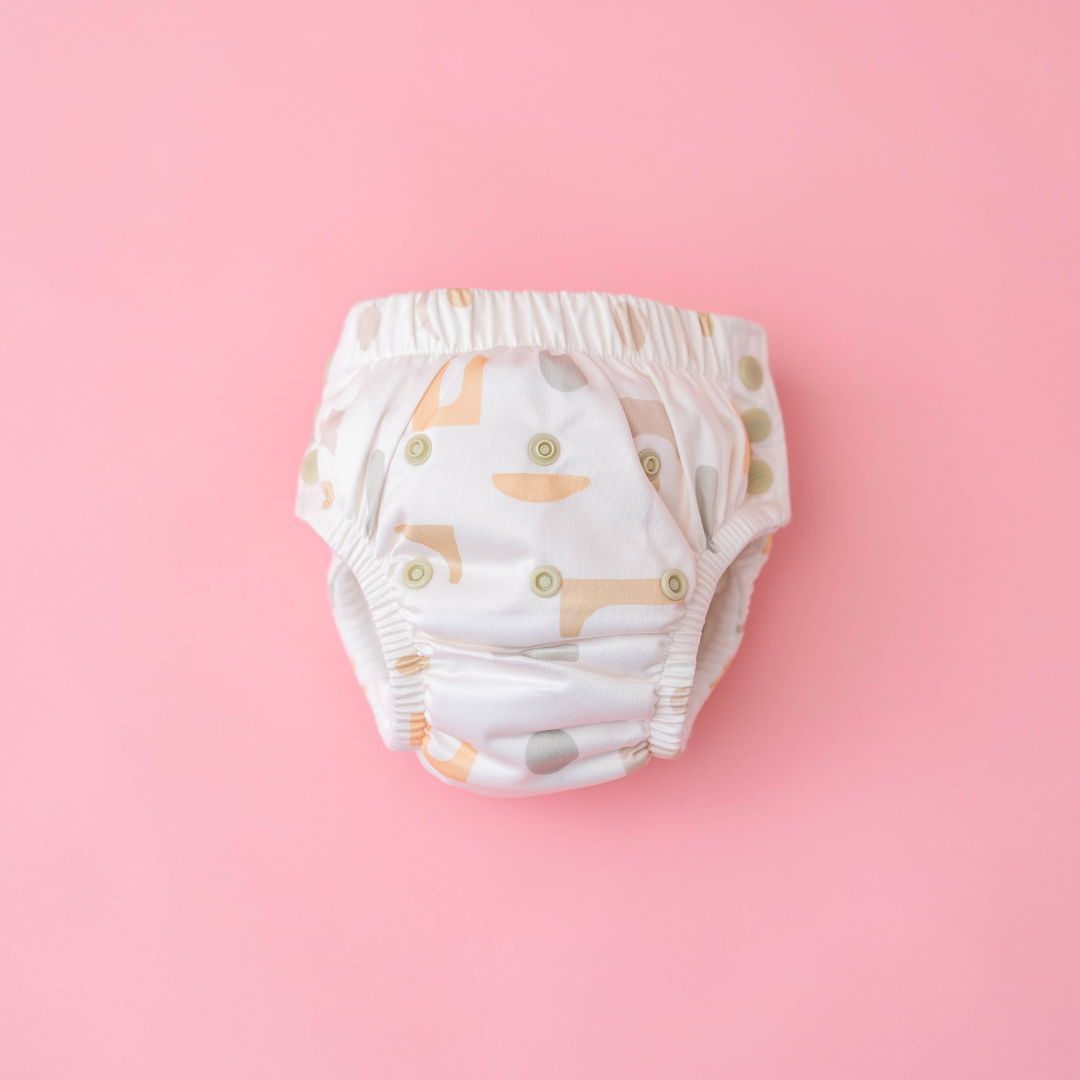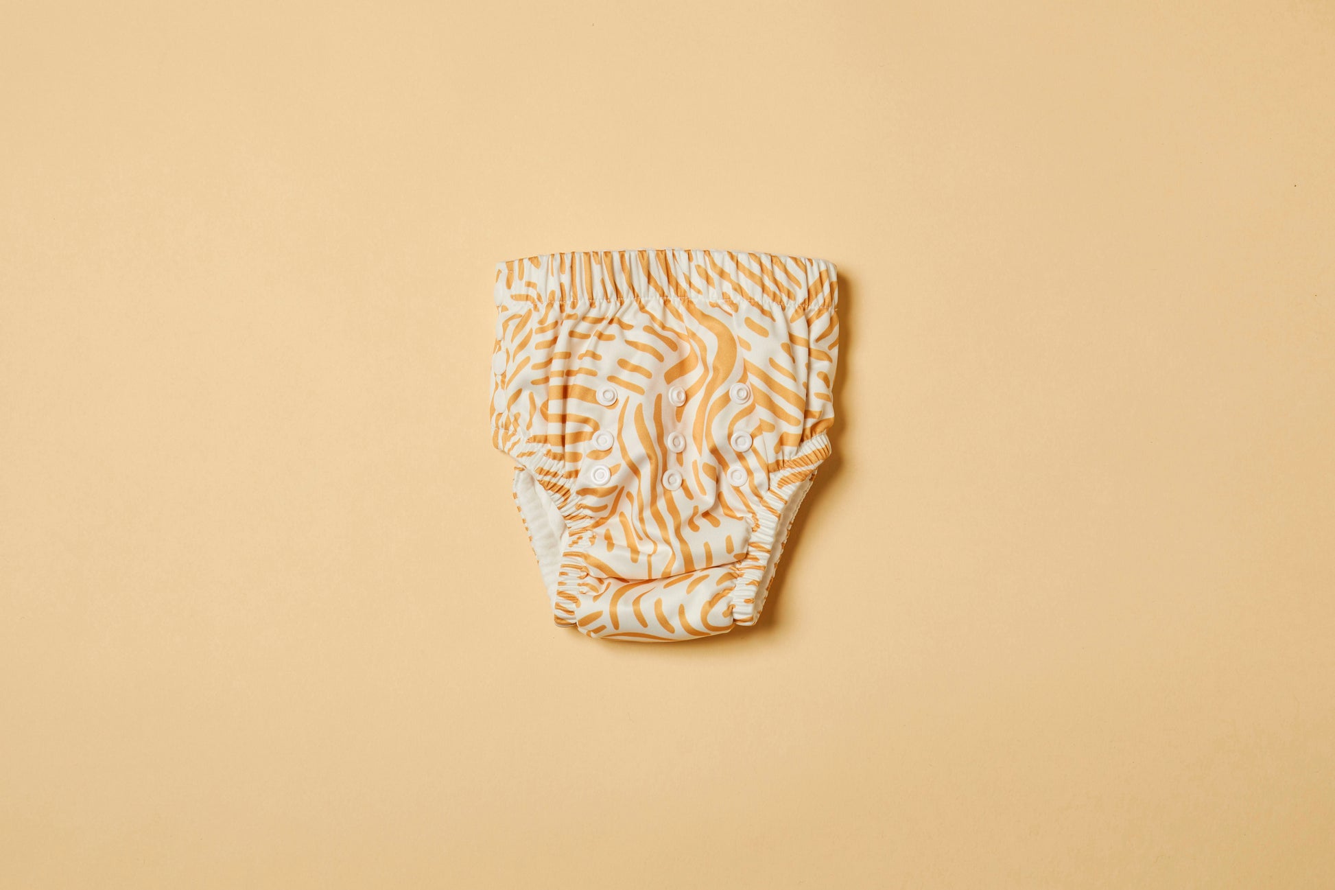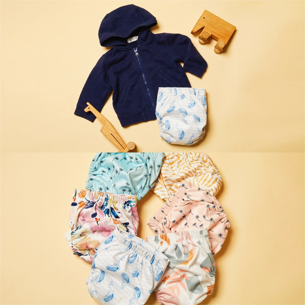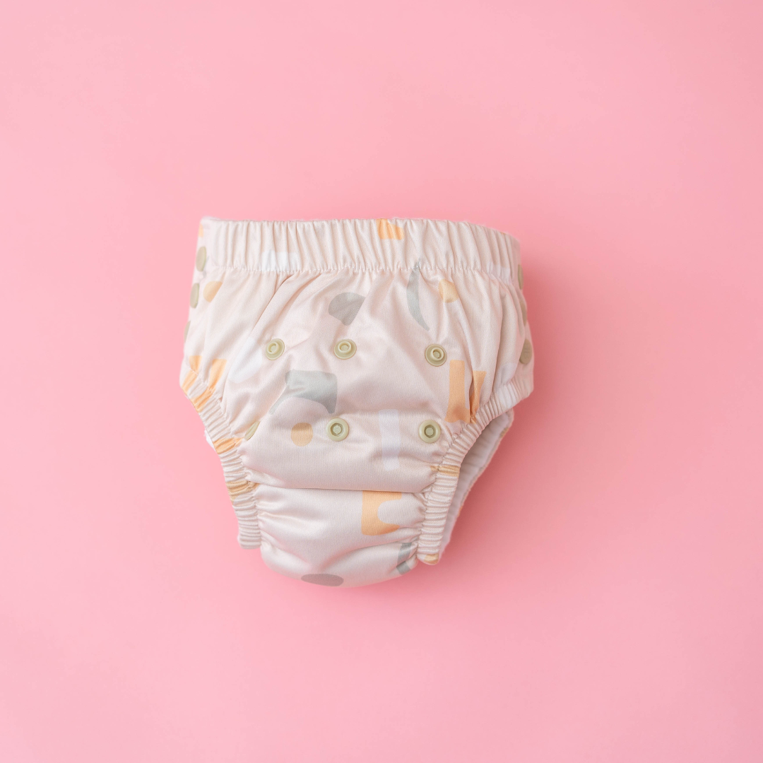 外側は使用済みポリエステルから、内側はオーガニックコットンと竹から作ったレーヨンで作られています。テープと同じように1-2回分のおしっこをしっかり吸収するけれども、濡れたら気持ち悪くて赤ちゃんが教えてくれるので、トイレットラーニングにもぴったりです。濡れたらすぐに替えること、そして毎回「おしっこでたね」と声を掛けることで、排泄の意識が育ちます。