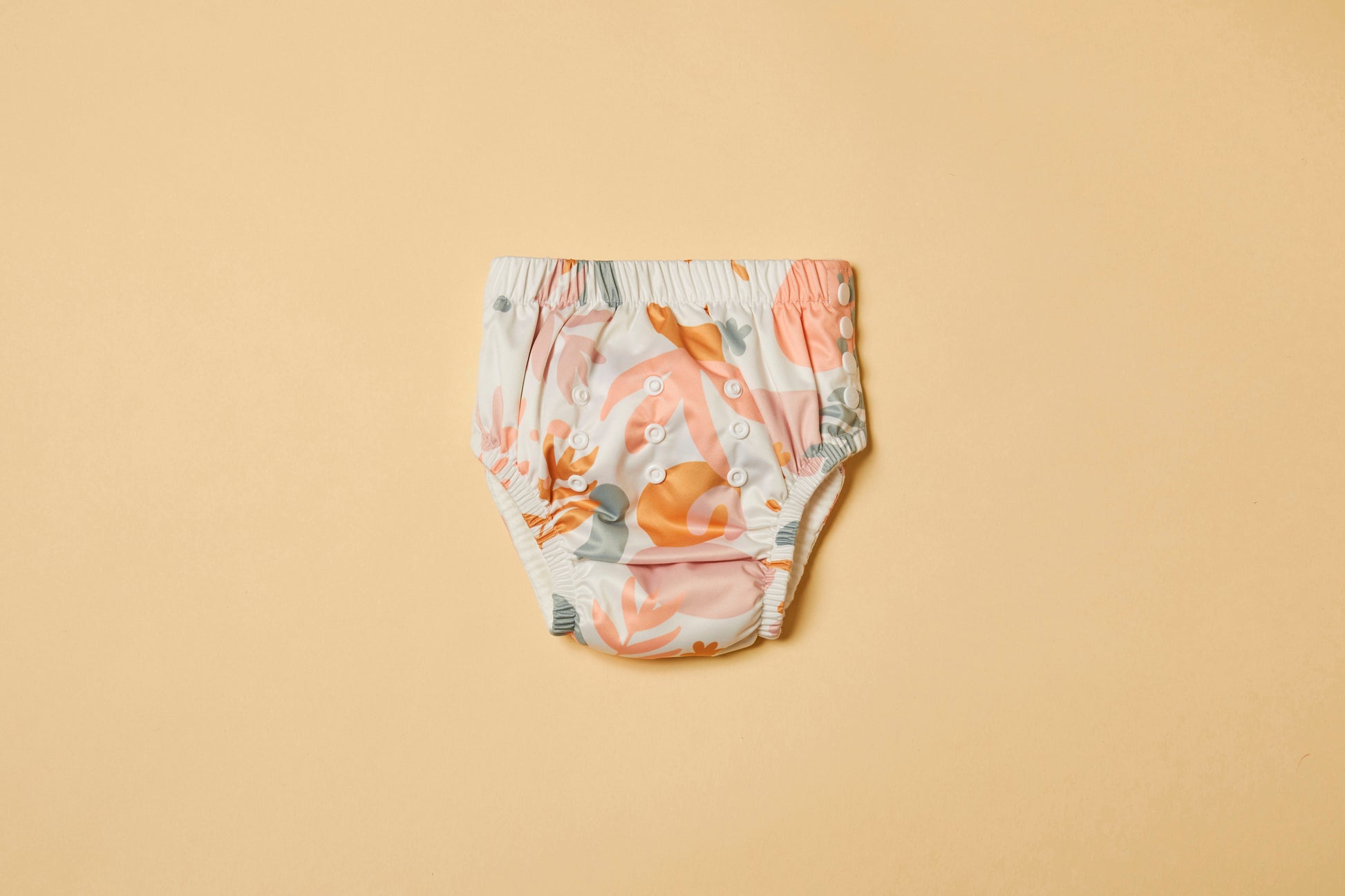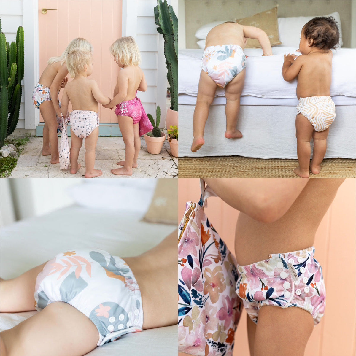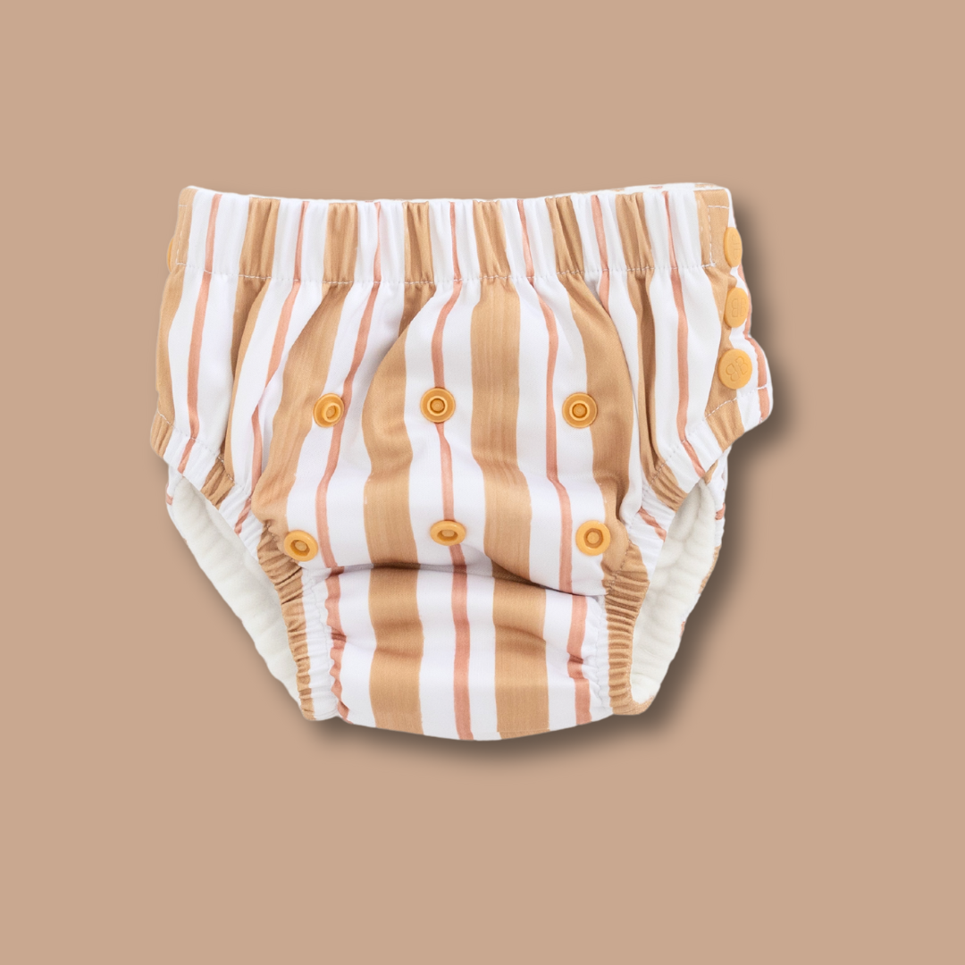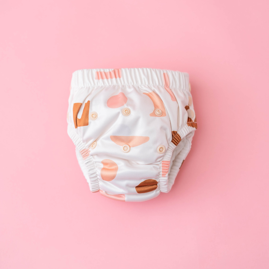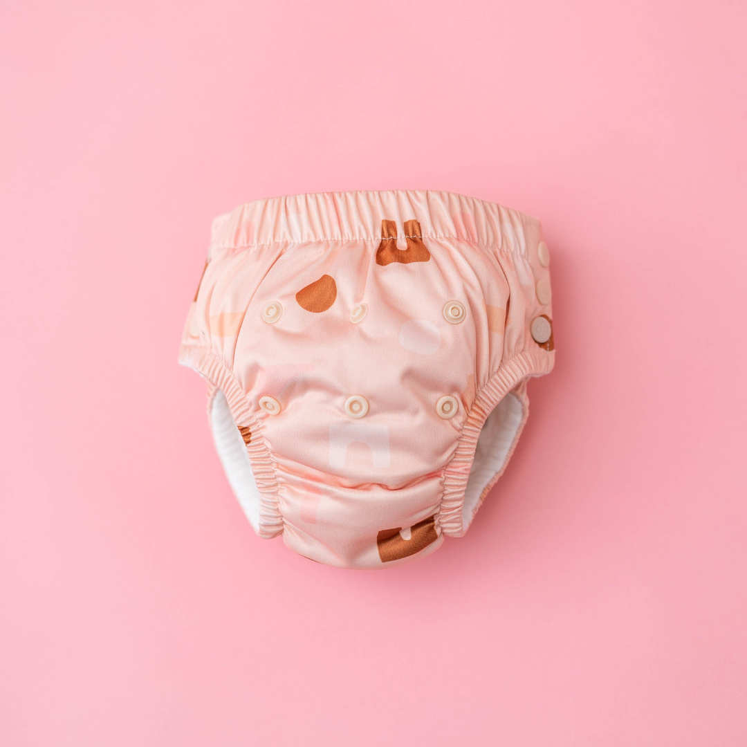 外側は使用済みポリエステルから、内側はオーガニックコットンと竹から作ったレーヨンで作られています。テープと同じように1-2回分のおしっこをしっかり吸収するけれども、濡れたら気持ち悪くて赤ちゃんが教えてくれるので、トイレットラーニングにもぴったりです。濡れたらすぐに替えること、そして毎回「おしっこでたね」と声を掛けることで、排泄の意識が育ちます。