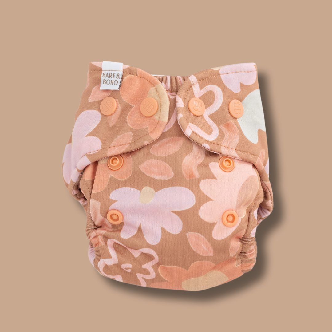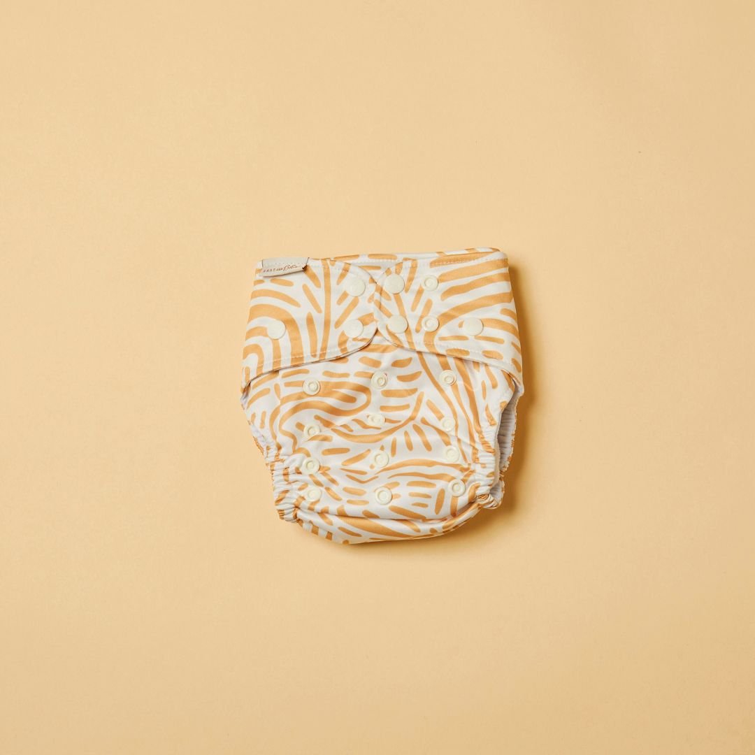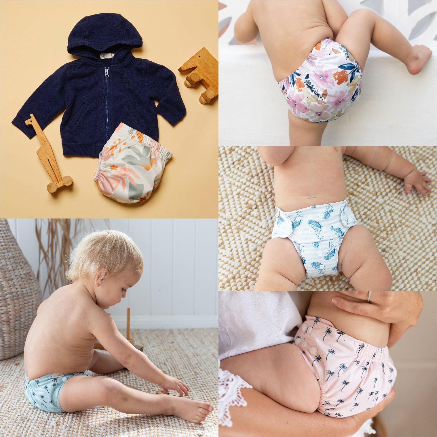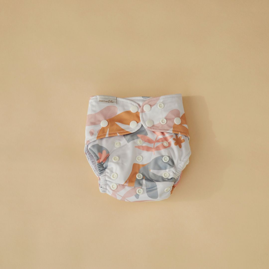 使用済みペットボトルから作られたポリエステル100%のおむつカバーで、地球にやさしい。おむつのすてきな柄はオーストラリア人デザイナーがBare and Bohoのためにデザインしています。