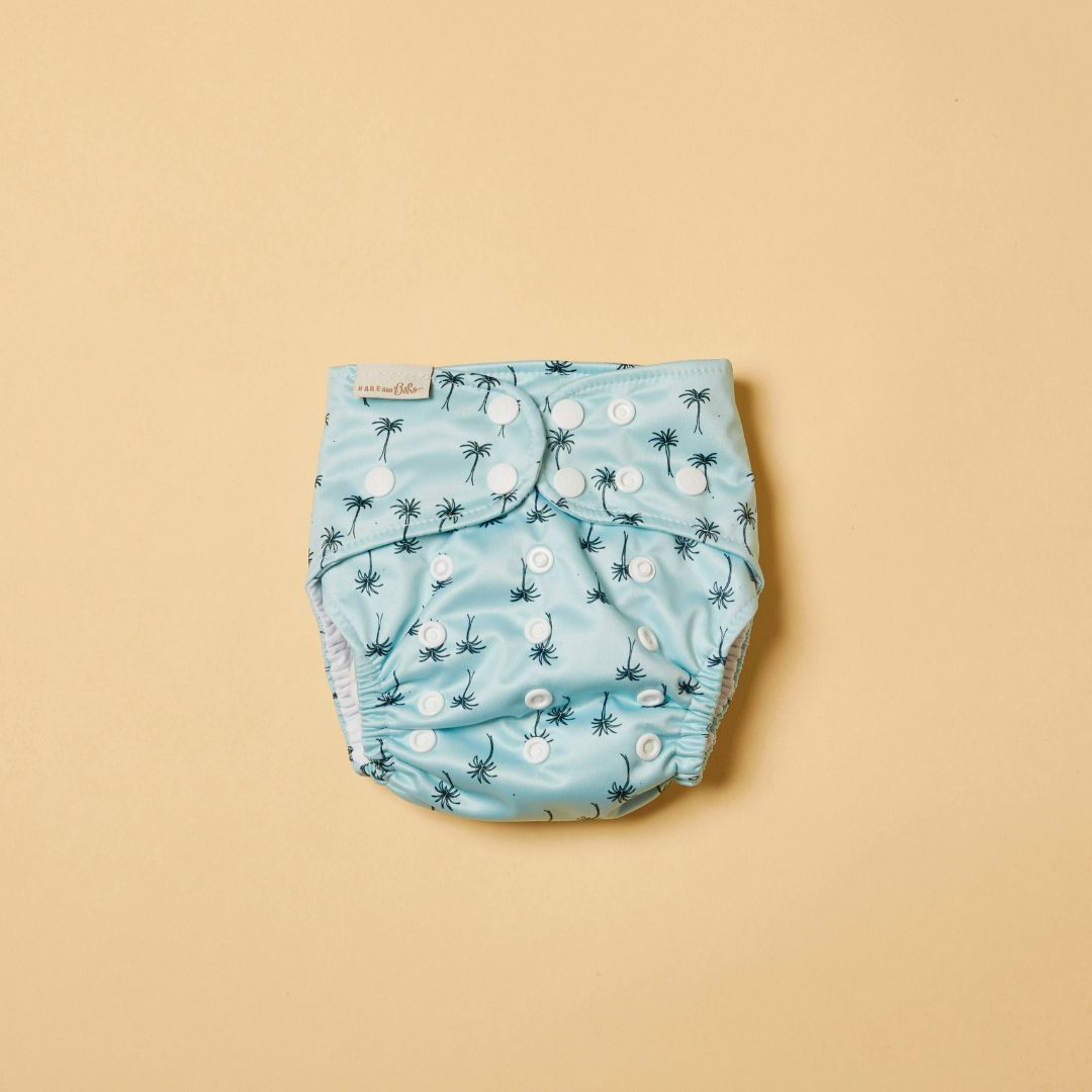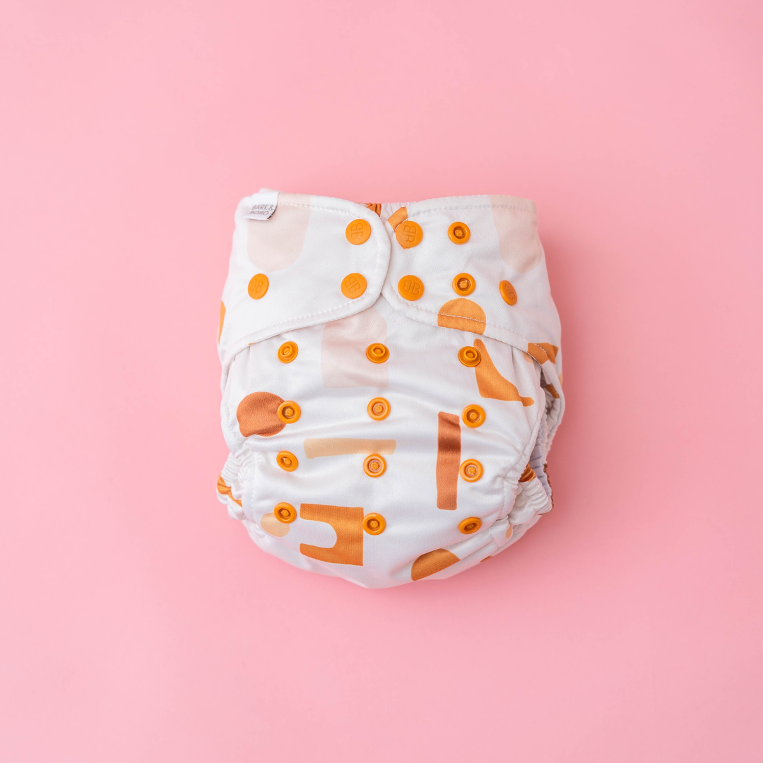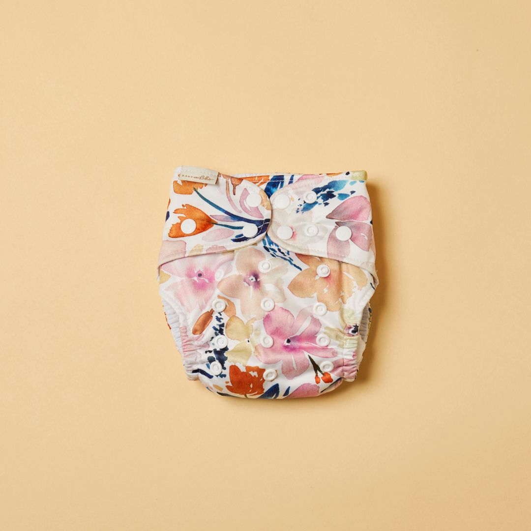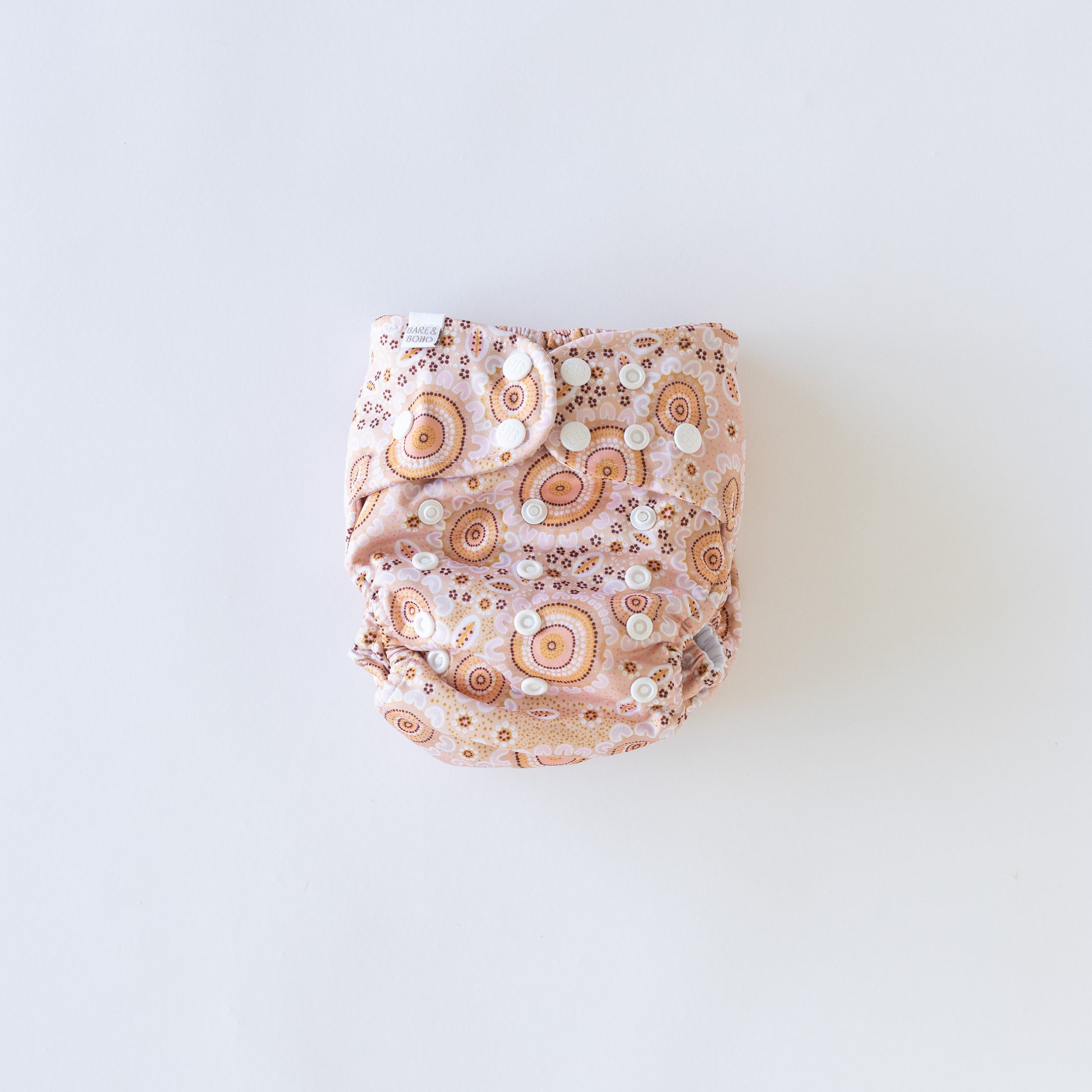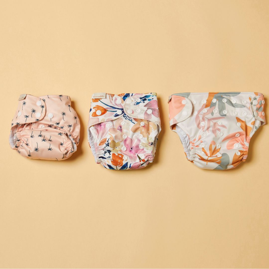 使用済みペットボトルから作られたポリエステル100%のおむつカバーで、地球にやさしい。おむつのすてきな柄はオーストラリア人デザイナーがBare and Bohoのためにデザインしています。